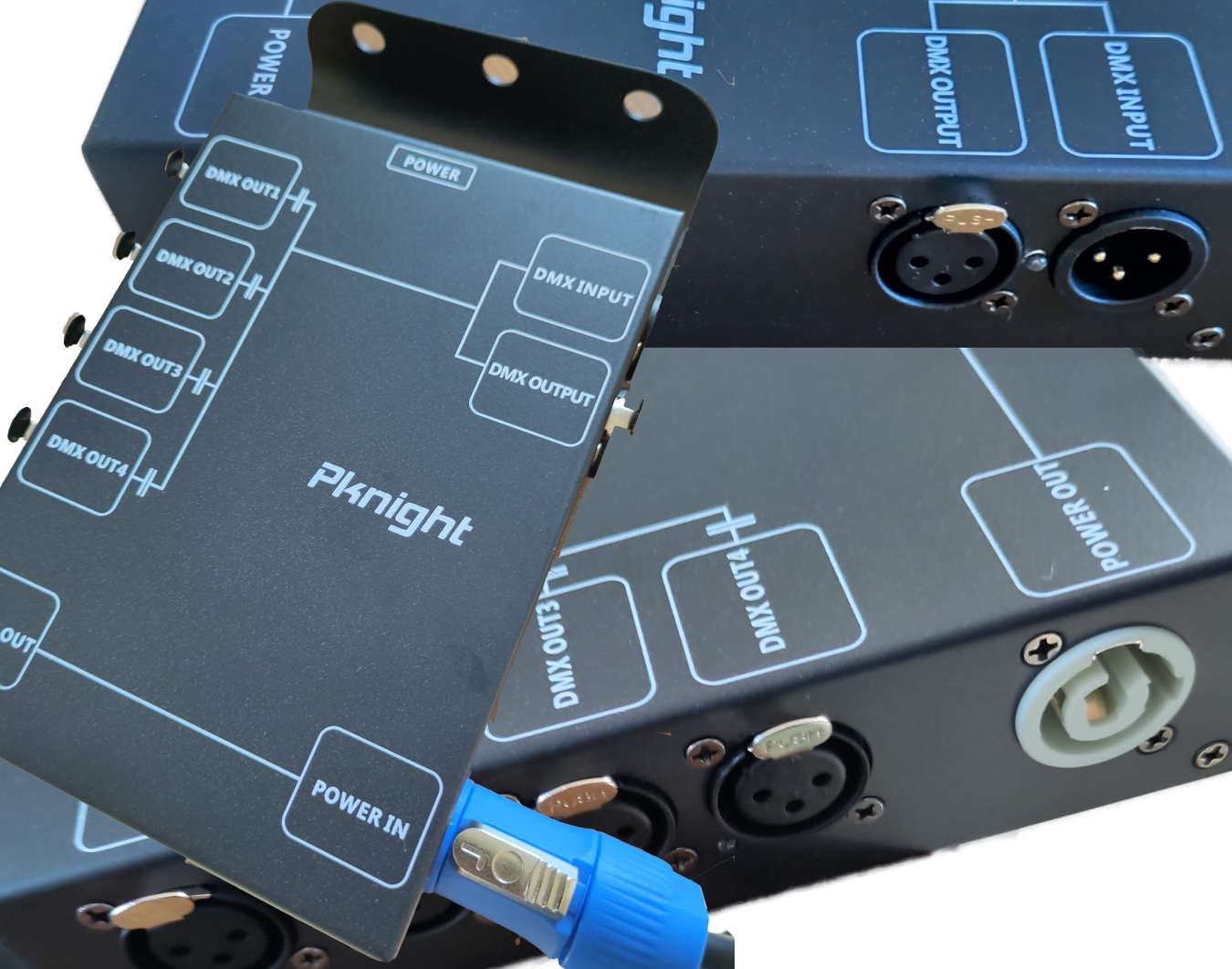 Ter vervanging van de defect distributieunit voor DMX hebben we deze compacte (powercon) unit aangeschaft. Met alle maal 3 pool DMX connectors, dus geen verloopjes meer. Hij zou ook met een haak in de truss kunnen.